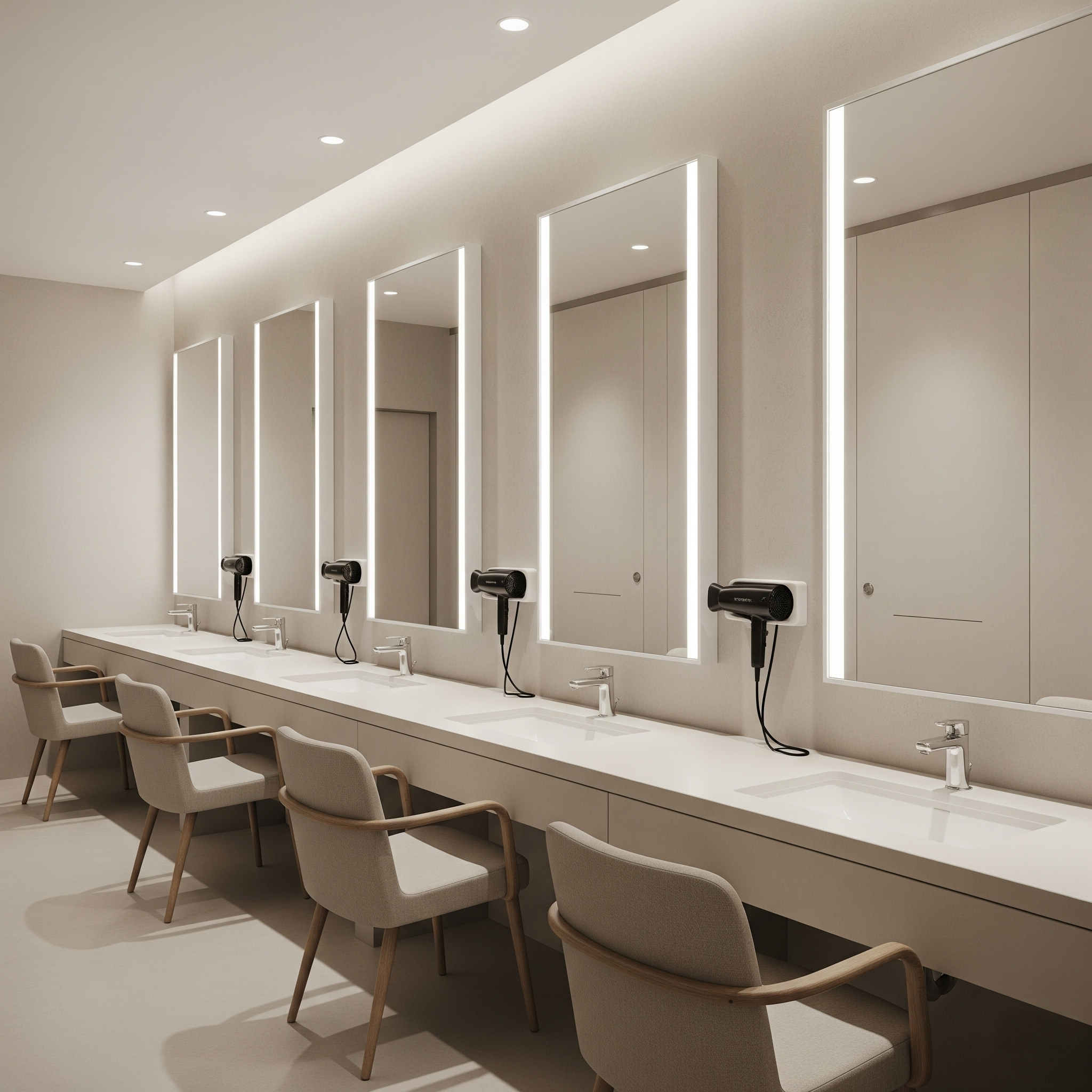 トレーニング後も、心地よい時間を。落ち着いて身だしなみを整えていただけるよう、明るく落ち着いた雰囲気のメイクルームを